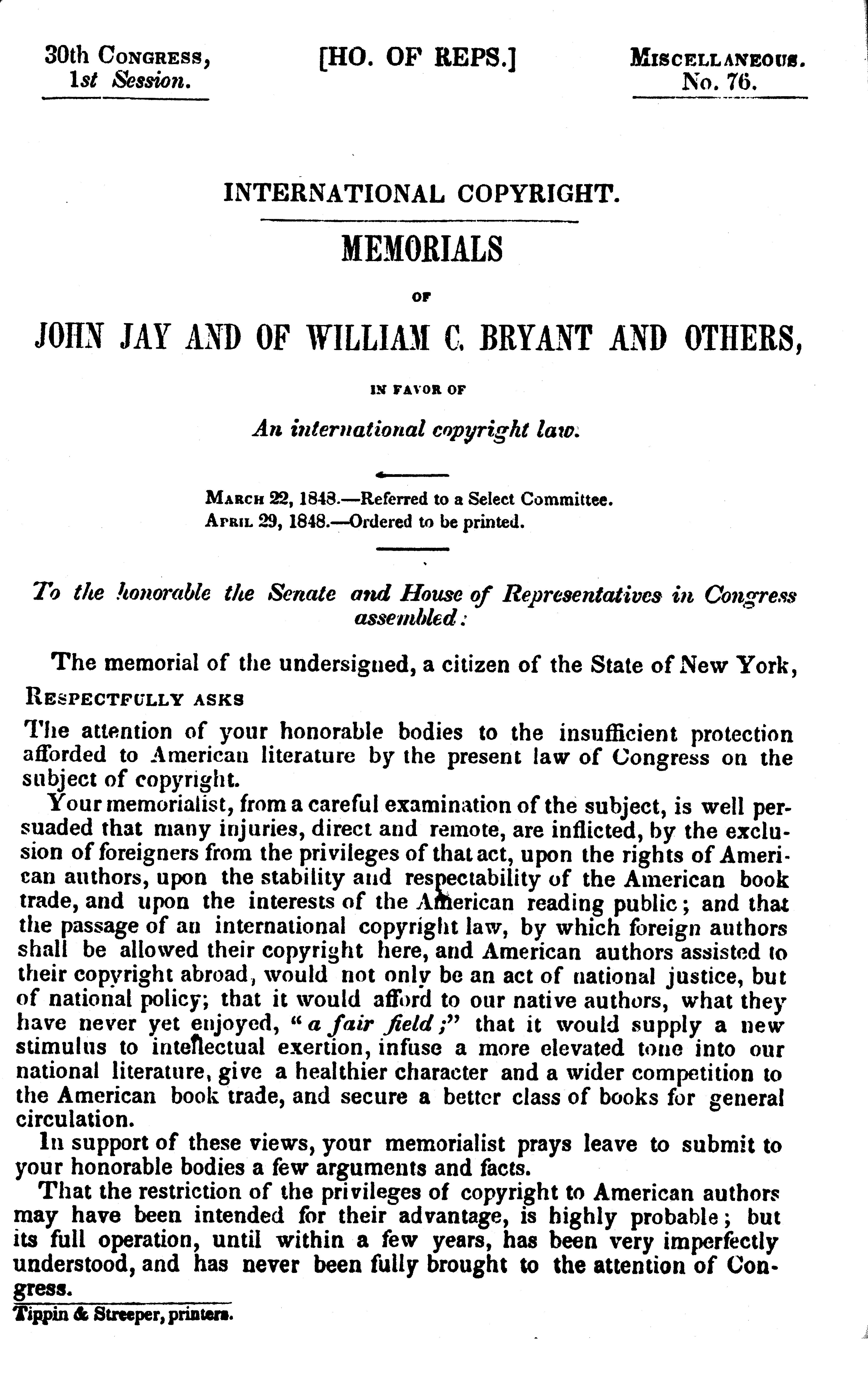 Source: The University of Texas Tarlton Law Library: Memorials of John Jay and of William C. Bryant and Others, in favor of An international copyright law, 30th Cong, 1st sess., 1848, H. Doc. 76